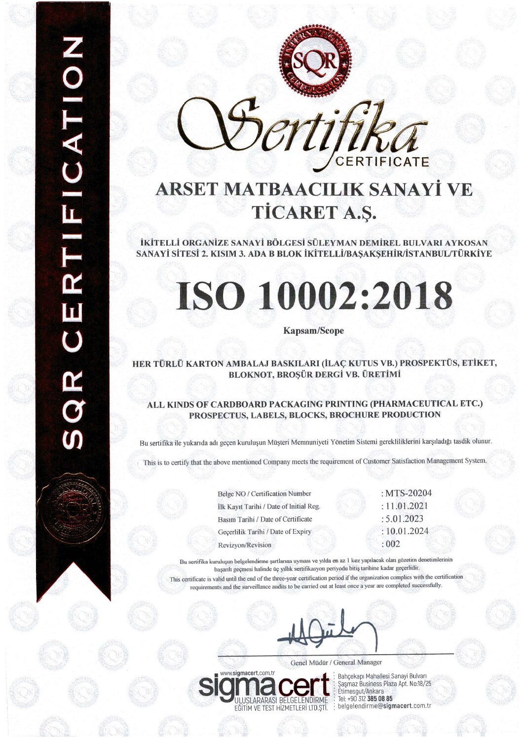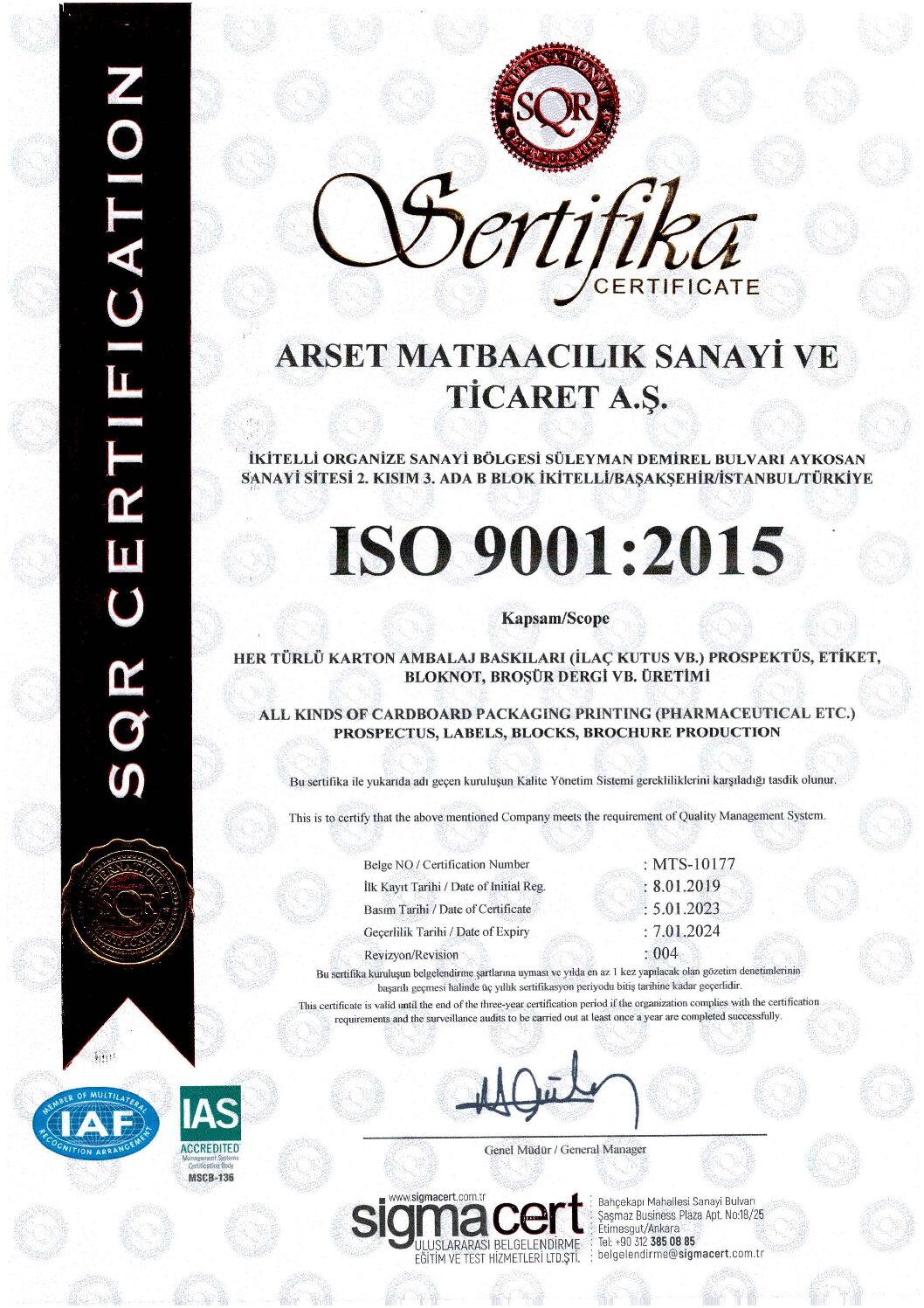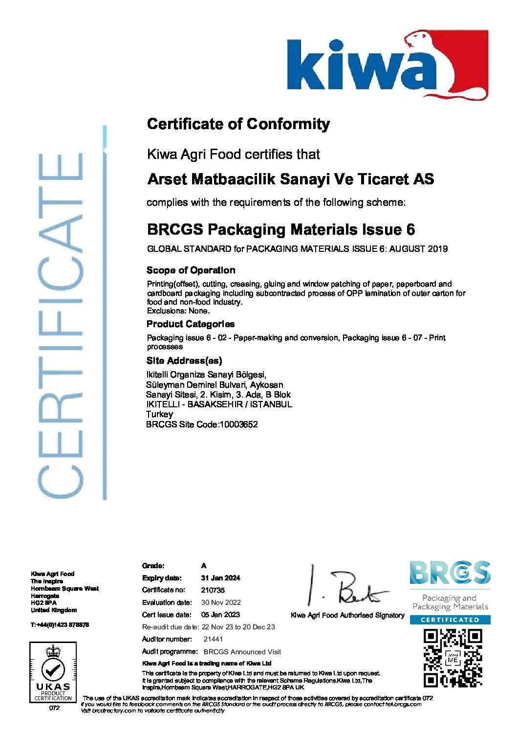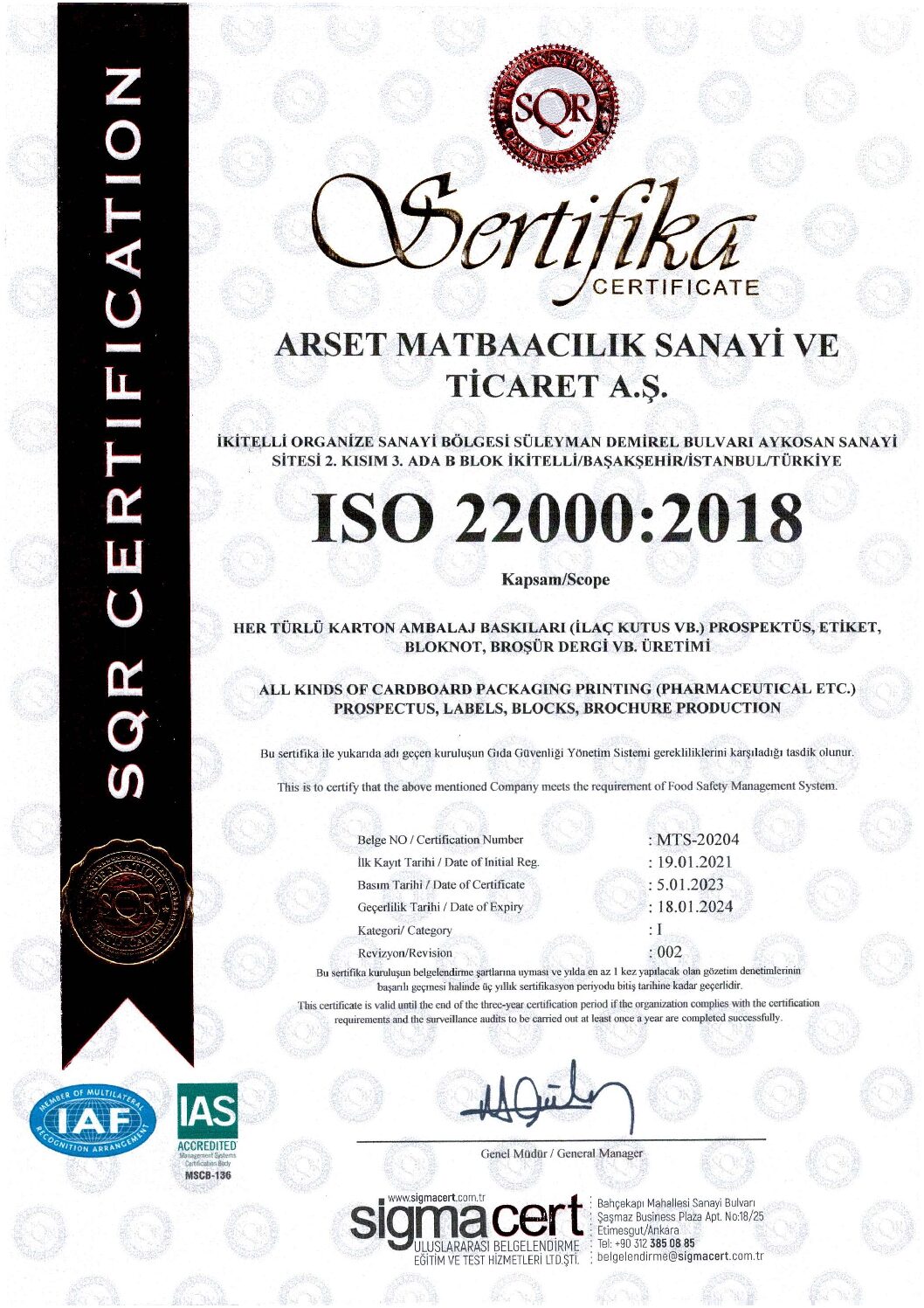 Sürekli büyümeyi kendine ilke edinen, istikrarlı gelişmesini ve kaliteli ürünlerini hızlı üretimle birleştiren ARSET, kuruluş tarihi olan 1977 yılından günümüze kadar geçen zaman diliminde, güven ve kalite sloganını hayata geçirmenin haklı gururunu yaşamaktadır. Kalite Sloganını da ISO 9001:2015, ISO 10002:2018, ISO 14001:2015, ISO 22000:2018, ISO 45001:2018 ve son olarak ta BRCGS Packaging ile taçlandırmıştır.